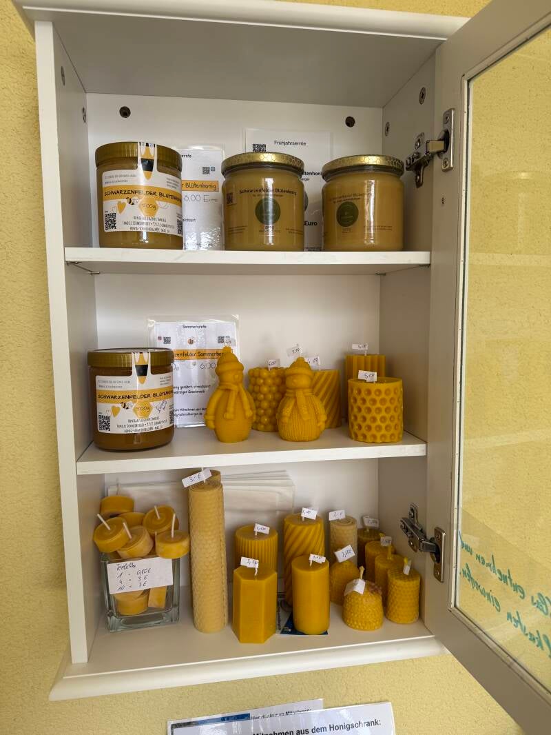 Honig und Honigprodukte, jederzeit zum Mitnehmen, gibt es aus unserem Honigschrank an der Haustür Lothradweg 60a in Schwarzenfeld. Der Geldbetrag kann direkt in den Briefkasten geworfen werden.